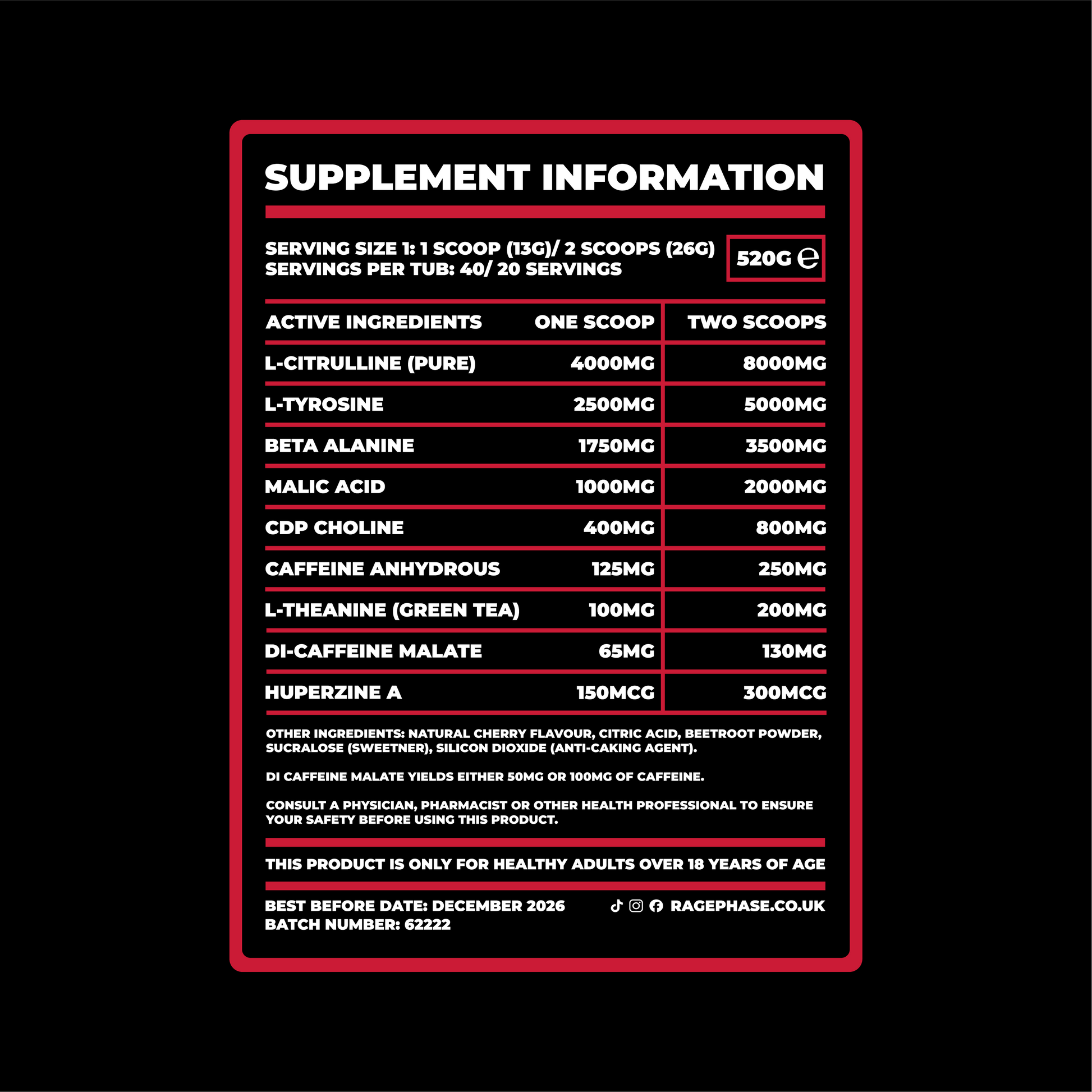 RAGEPHASE uses science to accurately and effectively dose ingredients to make it one of the best dosed formulas in the UK. We include stand out dosages such as 5000mg of L-Tyrosine which will help increase alertness, focus and elevate your mood. We have a delicious flavour profile and include only natural colours and flavourings. Try RAGEPHASE today and have your say!
